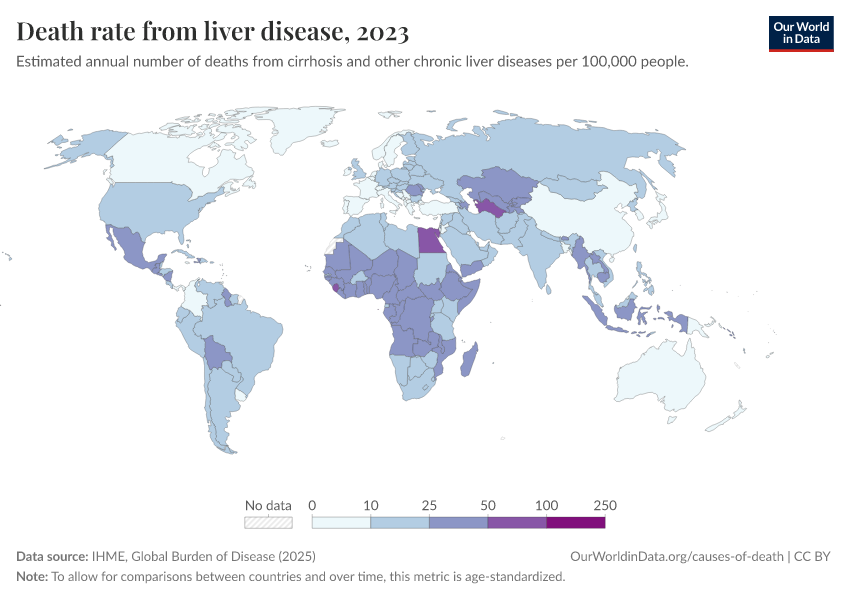 IHME, Global Burden of Disease (2025) – with major processing by Our World in Data. “Death rate from liver disease – IHME” [dataset]. IHME, Global Burden of Disease, “Global Burden of Disease - Deaths” [original data]. Retrieved April 10, 2026 from https://gfs-wave-2-new.owid.pages.dev:8789/20260323-161325/grapher/death-rate-from-liver-disease.html (archived on March 23, 2026).