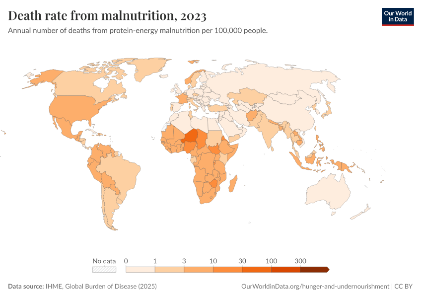 IHME, Global Burden of Disease (2025) – with major processing by Our World in Data. “Death rate from malnutrition – IHME” [dataset]. IHME, Global Burden of Disease, “Global Burden of Disease - Deaths” [original data]. Retrieved April 10, 2026 from https://gfs-wave-2-new.owid.pages.dev:8789/20260323-161325/grapher/death-rate-from-malnutrition.html (archived on March 23, 2026).