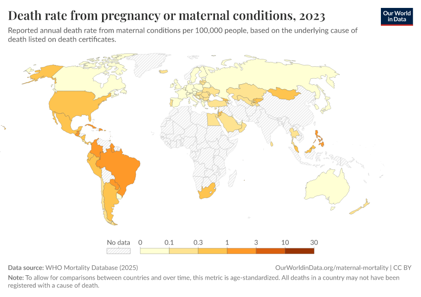 WHO Mortality Database (2025) – with minor processing by Our World in Data. “Death rate from pregnancy or maternal conditions – WHO” [dataset]. WHO Mortality Database, “WHO Mortality Database” [original data]. Retrieved April 10, 2026 from https://gfs-wave-2-new.owid.pages.dev:8789/20260319-180137/grapher/death-rate-from-maternal-disorders.html (archived on March 19, 2026).Download