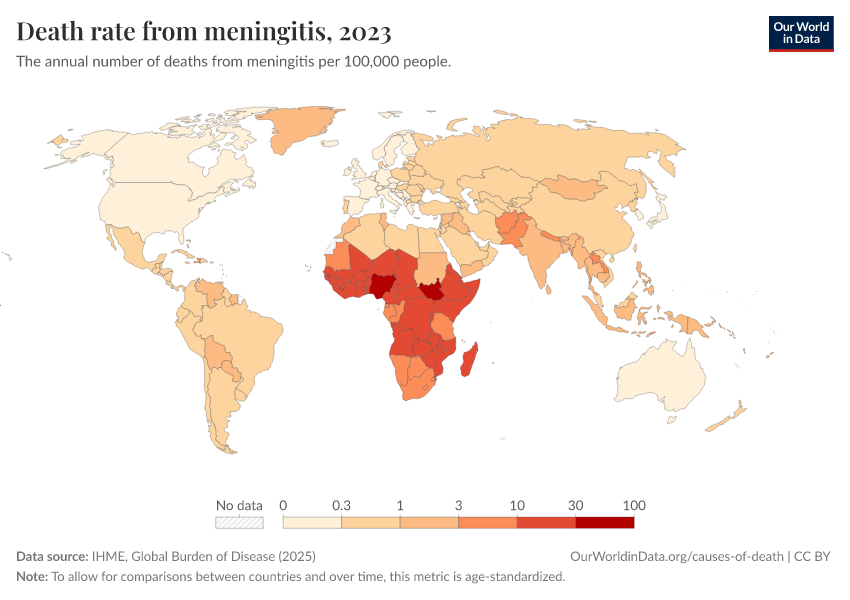 “Data Page: Death rate from meningitis”, part of the following publication: Esteban Ortiz-Ospina and Max Roser (2016) - “Global Health”. Data adapted from IHME, Global Burden of Disease. Retrieved from https://gfs-wave-2-new.owid.pages.dev:8789/20260323-161325/grapher/death-rate-from-meningitis.html [online resource] (archived on March 23, 2026).How to cite this data