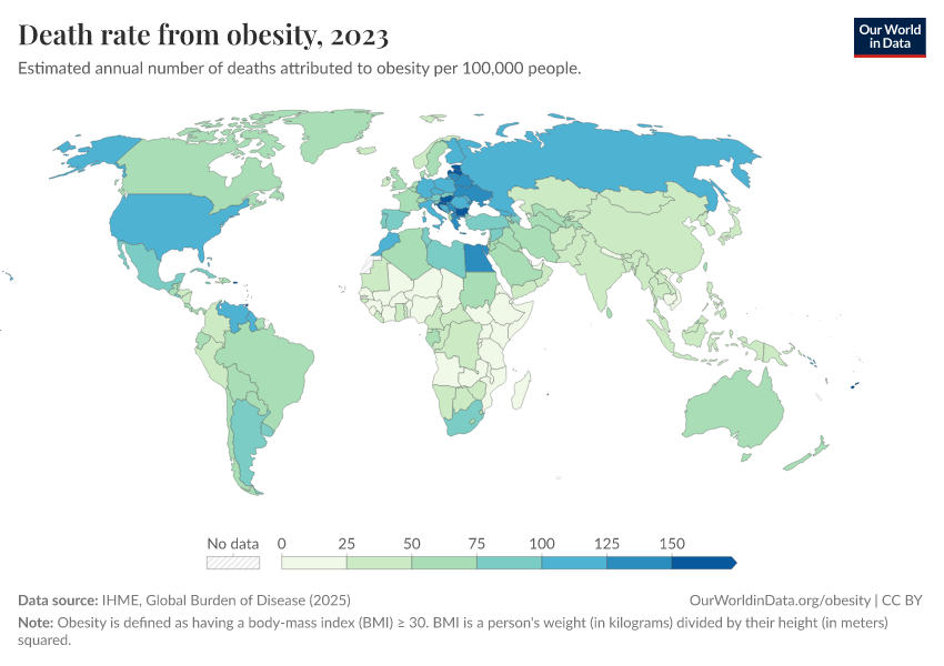 IHME, Global Burden of Disease (2025) – with major processing by Our World in Data. “Death rate from obesity – IHME” [dataset]. IHME, Global Burden of Disease, “Global Burden of Disease - Risk Factors - Deaths” [original data]. Retrieved April 10, 2026 from https://gfs-wave-2-new.owid.pages.dev:8789/20260319-180505/grapher/death-rate-from-obesity-gbd.html (archived on March 19, 2026).
