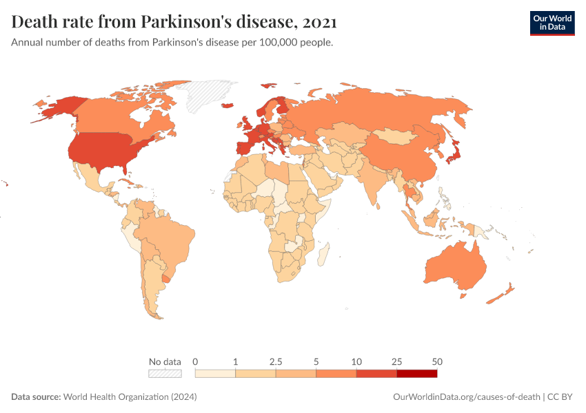 World Health Organization (2024) – with major processing by Our World in Data. “Death rate from Parkinson's disease” [dataset]. World Health Organization, “Global Health Estimates” [original data]. Retrieved April 10, 2026 from https://gfs-wave-2-new.owid.pages.dev:8789/20260325-171315/grapher/death-rate-from-parkinsons-disease-ghe.html (archived on March 25, 2026).Download