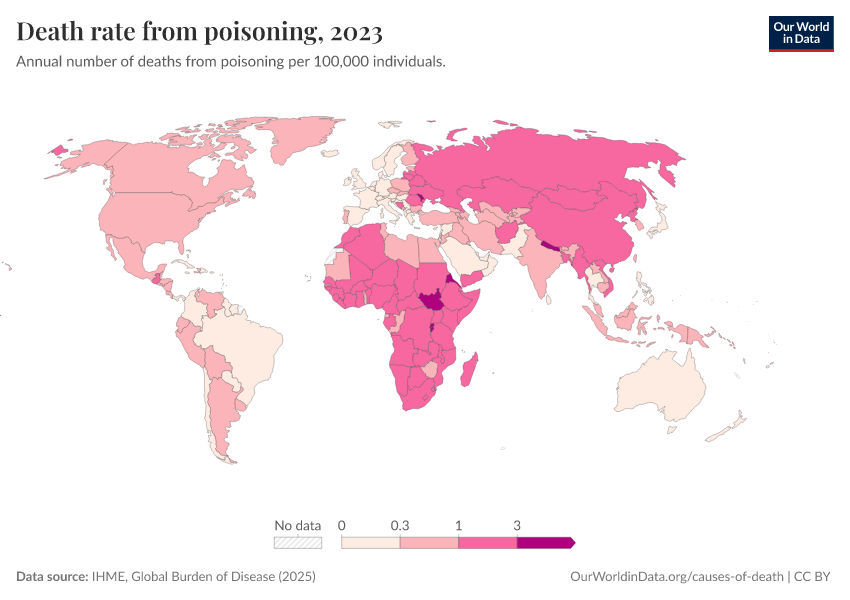 IHME, Global Burden of Disease (2025) – with major processing by Our World in Data. “Death rate from poisoning – IHME” [dataset]. IHME, Global Burden of Disease, “Global Burden of Disease - Deaths” [original data]. Retrieved April 10, 2026 from https://gfs-wave-2-new.owid.pages.dev:8789/20260323-161325/grapher/death-rate-from-poisoning-gbd.html (archived on March 23, 2026).