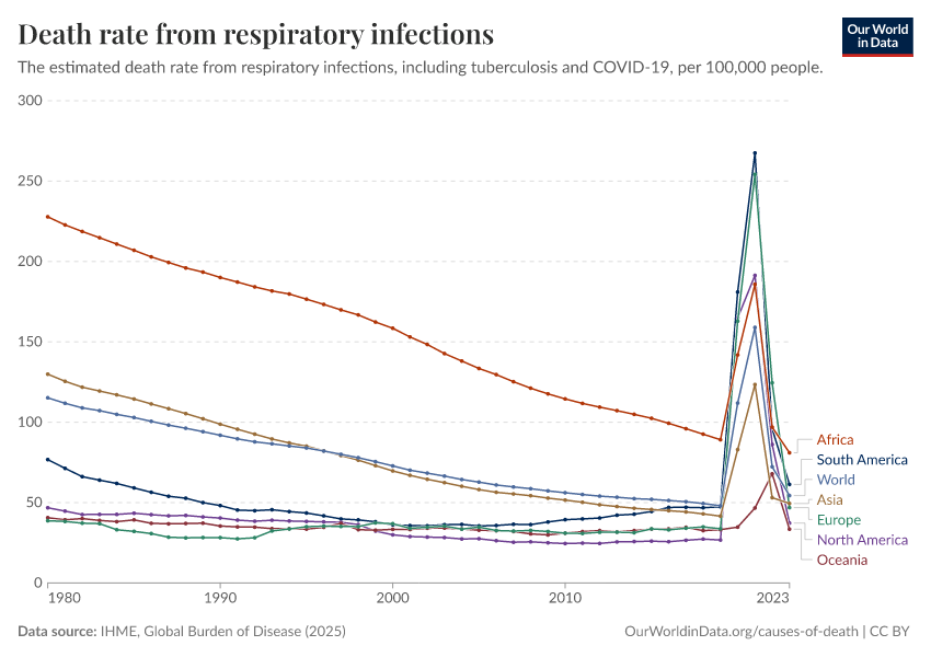 IHME, Global Burden of Disease (2025) – with major processing by Our World in Data. “Death rate from respiratory infections – IHME” [dataset]. IHME, Global Burden of Disease, “Global Burden of Disease - Deaths” [original data]. Retrieved April 10, 2026 from https://gfs-wave-2-new.owid.pages.dev:8789/20260323-161325/grapher/death-rate-from-respiratory-infections-gbd.html (archived on March 23, 2026).