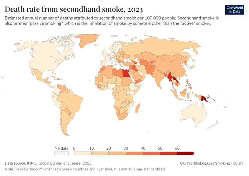 “Data Page: Death rate from secondhand smoke”, part of the following publication: Esteban Ortiz-Ospina and Max Roser (2016) - “Global Health”. Data adapted from IHME, Global Burden of Disease. Retrieved from https://gfs-wave-2-new.owid.pages.dev:8789/20260319-180505/grapher/death-rate-from-secondhand-smoke.html [online resource] (archived on March 19, 2026).How to cite this data