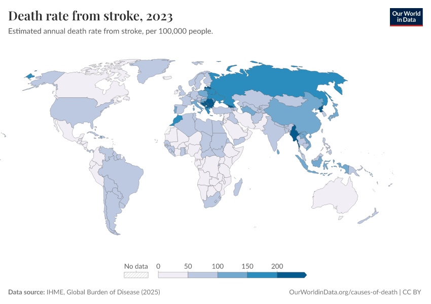IHME, Global Burden of Disease (2025) – with major processing by Our World in Data. “Death rate from stroke – IHME” [dataset]. IHME, Global Burden of Disease, “Global Burden of Disease - Deaths” [original data]. Retrieved April 10, 2026 from https://gfs-wave-2-new.owid.pages.dev:8789/20260323-161325/grapher/death-rate-from-strokes.html (archived on March 23, 2026).