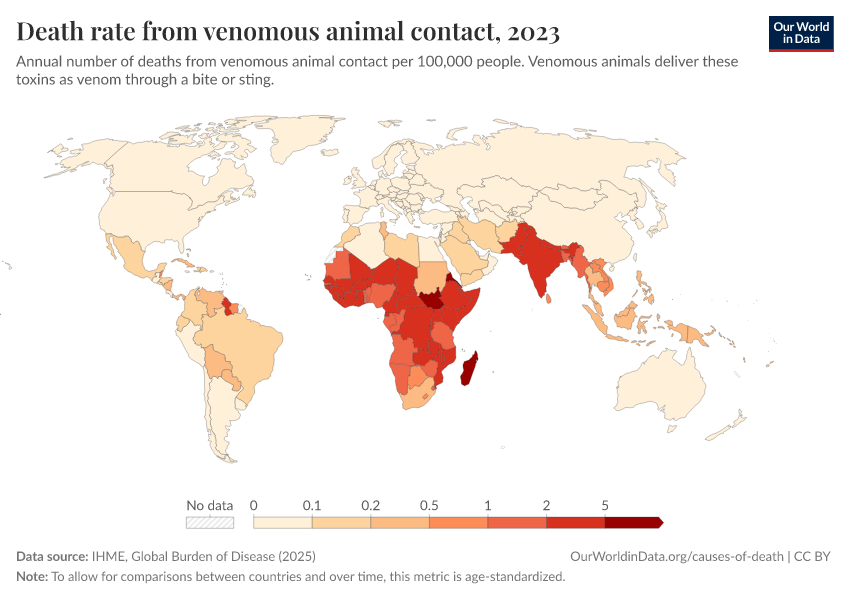 IHME, Global Burden of Disease (2025) – with major processing by Our World in Data. “Death rate from venomous animal contact – IHME” [dataset]. IHME, Global Burden of Disease, “Global Burden of Disease - Deaths” [original data]. Retrieved April 10, 2026 from https://gfs-wave-2-new.owid.pages.dev:8789/20260323-161325/grapher/death-rate-from-venomous-animal.html (archived on March 23, 2026).