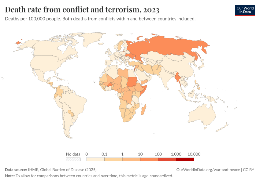 “Data Page: Death rate from conflict and terrorism”, part of the following publication: Esteban Ortiz-Ospina and Max Roser (2016) - “Global Health”. Data adapted from IHME, Global Burden of Disease. Retrieved from https://gfs-wave-2-new.owid.pages.dev:8789/20260323-161325/grapher/death-rates-from-conflict-and-terrorism-gbd.html [online resource] (archived on March 23, 2026).How to cite this data