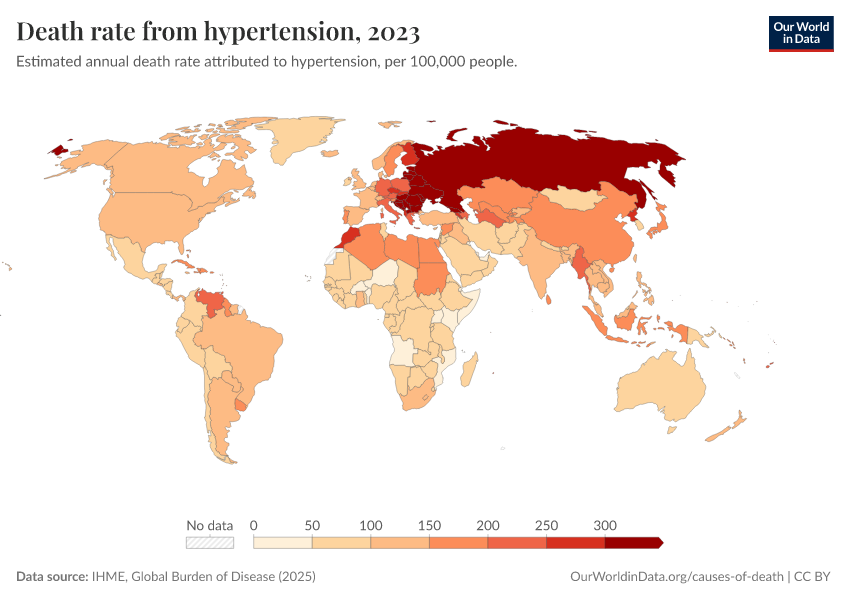 IHME, Global Burden of Disease (2025) – with major processing by Our World in Data. “Death rate from hypertension – IHME” [dataset]. IHME, Global Burden of Disease, “Global Burden of Disease - Risk Factors - Deaths” [original data]. Retrieved April 10, 2026 from https://gfs-wave-2-new.owid.pages.dev:8789/20260319-180505/grapher/death-rates-from-high-blood-pressure-gbd.html (archived on March 19, 2026).