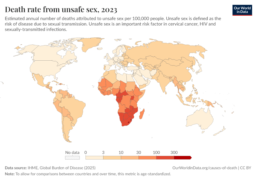 IHME, Global Burden of Disease (2025) – with major processing by Our World in Data. “Death rate from unsafe sex – IHME” [dataset]. IHME, Global Burden of Disease, “Global Burden of Disease - Risk Factors - Deaths” [original data]. Retrieved April 10, 2026 from https://gfs-wave-2-new.owid.pages.dev:8789/20260319-180505/grapher/death-rates-from-unsafe-sex.html (archived on March 19, 2026).