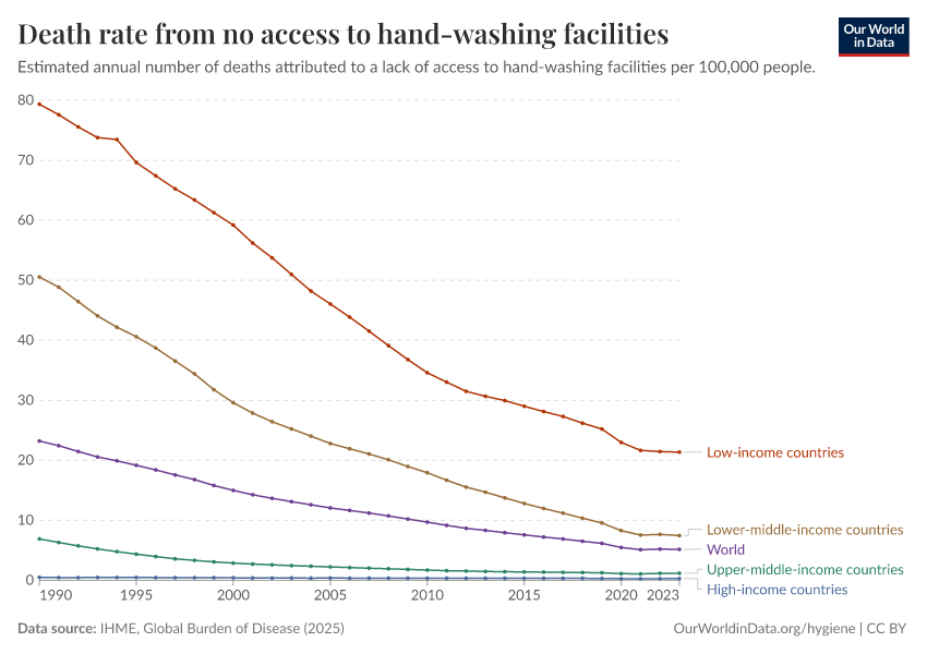 IHME, Global Burden of Disease (2025) – with major processing by Our World in Data. “Death rate from no access to hand-washing facilities – IHME” [dataset]. IHME, Global Burden of Disease, “Global Burden of Disease - Risk Factors - Deaths” [original data]. Retrieved April 10, 2026 from https://gfs-wave-2-new.owid.pages.dev:8789/20260319-180505/grapher/death-rates-no-handwashing.html (archived on March 19, 2026).