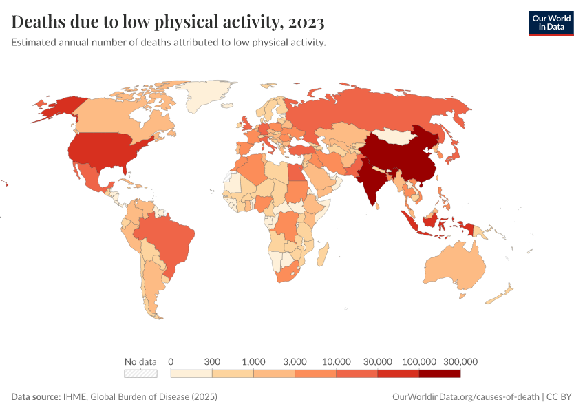 “Data Page: Deaths due to low physical activity”, part of the following publication: Esteban Ortiz-Ospina and Max Roser (2016) - “Global Health”. Data adapted from IHME, Global Burden of Disease. Retrieved from https://gfs-wave-2-new.owid.pages.dev:8789/20260319-180137/grapher/deaths-due-to-low-physical-activity.html [online resource] (archived on March 19, 2026).How to cite this data