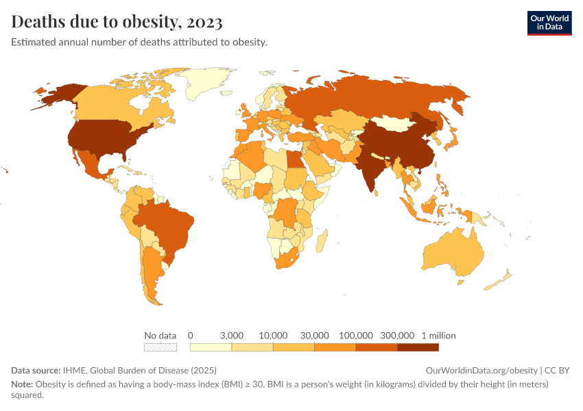 IHME, Global Burden of Disease (2025) – with major processing by Our World in Data. “Deaths due to obesity – IHME” [dataset]. IHME, Global Burden of Disease, “Global Burden of Disease - Risk Factors - Deaths” [original data]. Retrieved April 10, 2026 from https://gfs-wave-2-new.owid.pages.dev:8789/20260319-180137/grapher/deaths-due-to-obesity.html (archived on March 19, 2026).