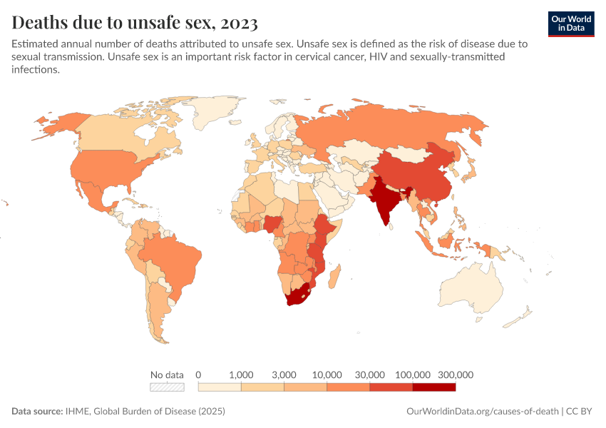 IHME, Global Burden of Disease (2025) – with major processing by Our World in Data. “Deaths due to unsafe sex – IHME” [dataset]. IHME, Global Burden of Disease, “Global Burden of Disease - Risk Factors - Deaths” [original data]. Retrieved April 10, 2026 from https://gfs-wave-2-new.owid.pages.dev:8789/20260319-180137/grapher/deaths-due-to-unsafe-sex.html (archived on March 19, 2026).