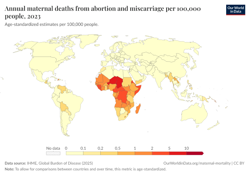 IHME, Global Burden of Disease (2025) – with major processing by Our World in Data. “Annual maternal deaths from abortion and miscarriage per 100,000 people – IHME” [dataset]. IHME, Global Burden of Disease, “Global Burden of Disease - Deaths” [original data]. Retrieved April 10, 2026 from https://gfs-wave-2-new.owid.pages.dev:8789/20260323-161325/grapher/deaths-from-abortion-and-miscarriage-per-100000-people.html (archived on March 23, 2026).