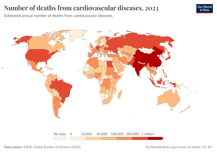 “Data Page: Number of deaths from cardiovascular diseases”, part of the following publication: Esteban Ortiz-Ospina and Max Roser (2016) - “Global Health”. Data adapted from IHME, Global Burden of Disease. Retrieved from https://gfs-wave-2-new.owid.pages.dev:8789/20260323-160356/grapher/deaths-from-cardiovascular-disease.html [online resource] (archived on March 23, 2026).How to cite this data