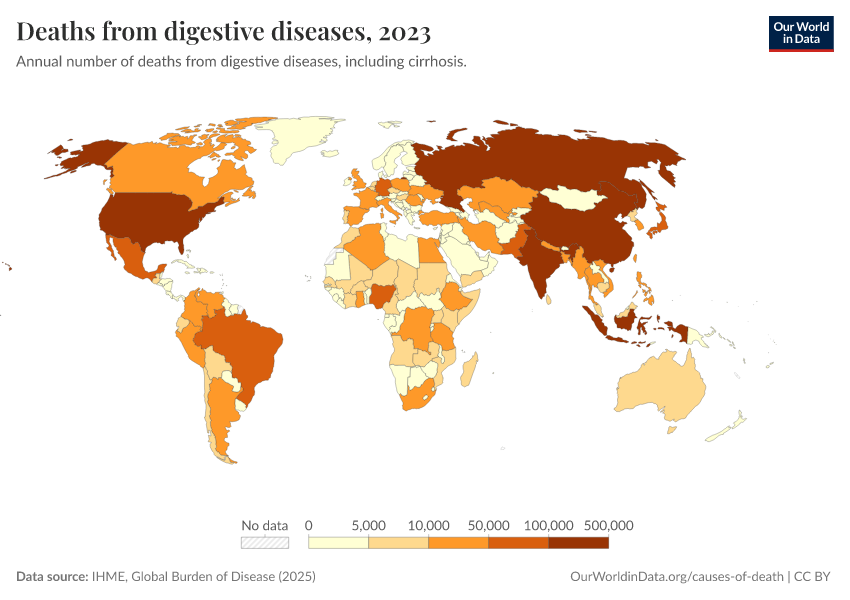 IHME, Global Burden of Disease (2025) – with major processing by Our World in Data. “Deaths from digestive diseases – IHME” [dataset]. IHME, Global Burden of Disease, “Global Burden of Disease - Deaths” [original data]. Retrieved April 10, 2026 from https://gfs-wave-2-new.owid.pages.dev:8789/20260323-160356/grapher/deaths-from-digestive-diseases.html (archived on March 23, 2026).