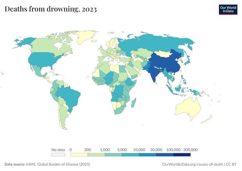 “Data Page: Deaths from drowning”, part of the following publication: Esteban Ortiz-Ospina and Max Roser (2016) - “Global Health”. Data adapted from IHME, Global Burden of Disease. Retrieved from https://gfs-wave-2-new.owid.pages.dev:8789/20260323-160356/grapher/deaths-from-drowning.html [online resource] (archived on March 23, 2026).How to cite this data