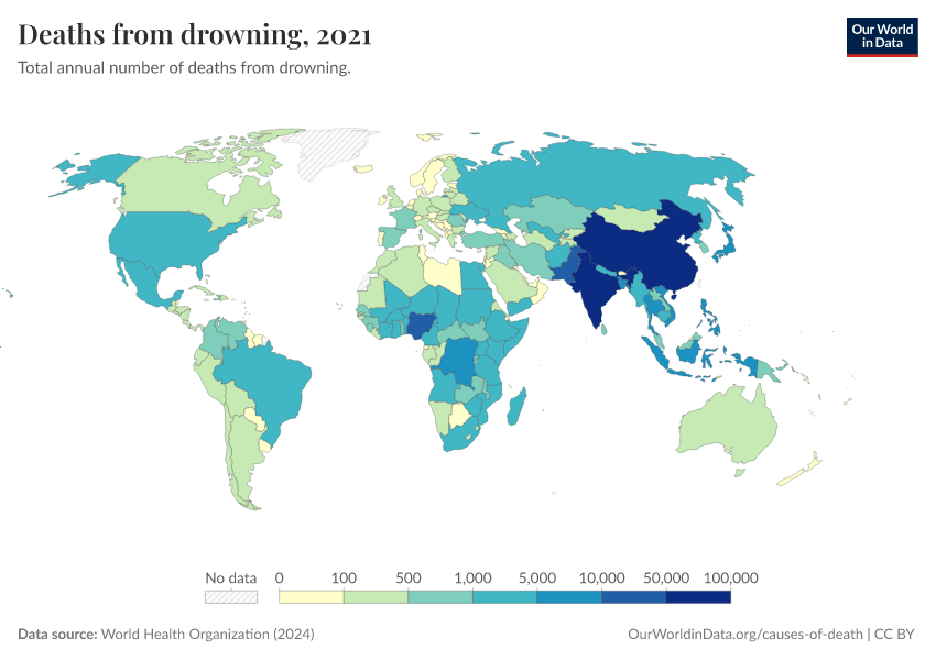 World Health Organization (2024) – with major processing by Our World in Data. “Deaths from drowning” [dataset]. World Health Organization, “Global Health Estimates” [original data]. Retrieved April 10, 2026 from https://gfs-wave-2-new.owid.pages.dev:8789/20260325-171315/grapher/deaths-from-drowning-ghe.html (archived on March 25, 2026).Download