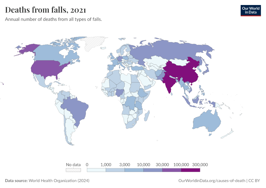 World Health Organization (2024) – with major processing by Our World in Data. “Deaths from falls” [dataset]. World Health Organization, “Global Health Estimates” [original data]. Retrieved April 10, 2026 from https://gfs-wave-2-new.owid.pages.dev:8789/20260325-171315/grapher/deaths-from-falls.html (archived on March 25, 2026).Download
