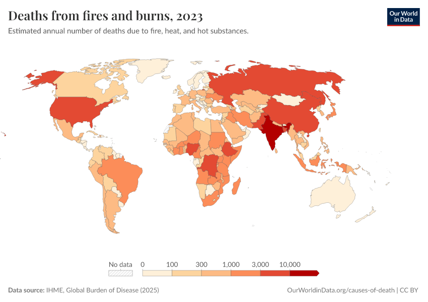 IHME, Global Burden of Disease (2025) – with major processing by Our World in Data. “Deaths from fires and burns – IHME” [dataset]. IHME, Global Burden of Disease, “Global Burden of Disease - Deaths” [original data]. Retrieved April 10, 2026 from https://gfs-wave-2-new.owid.pages.dev:8789/20260323-160356/grapher/deaths-from-fires-and-burns.html (archived on March 23, 2026).