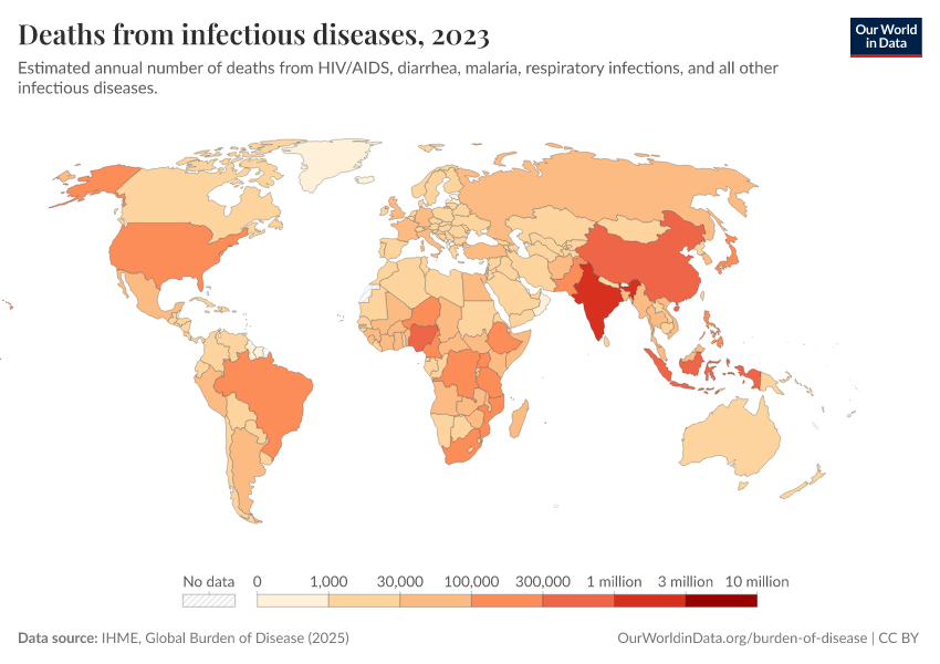 IHME, Global Burden of Disease (2025) – with major processing by Our World in Data. “Deaths from infectious diseases – IHME” [dataset]. IHME, Global Burden of Disease, “Global Burden of Disease - Deaths” [original data]. Retrieved April 10, 2026 from https://gfs-wave-2-new.owid.pages.dev:8789/20260323-160356/grapher/deaths-from-infectious-diseases.html (archived on March 23, 2026).