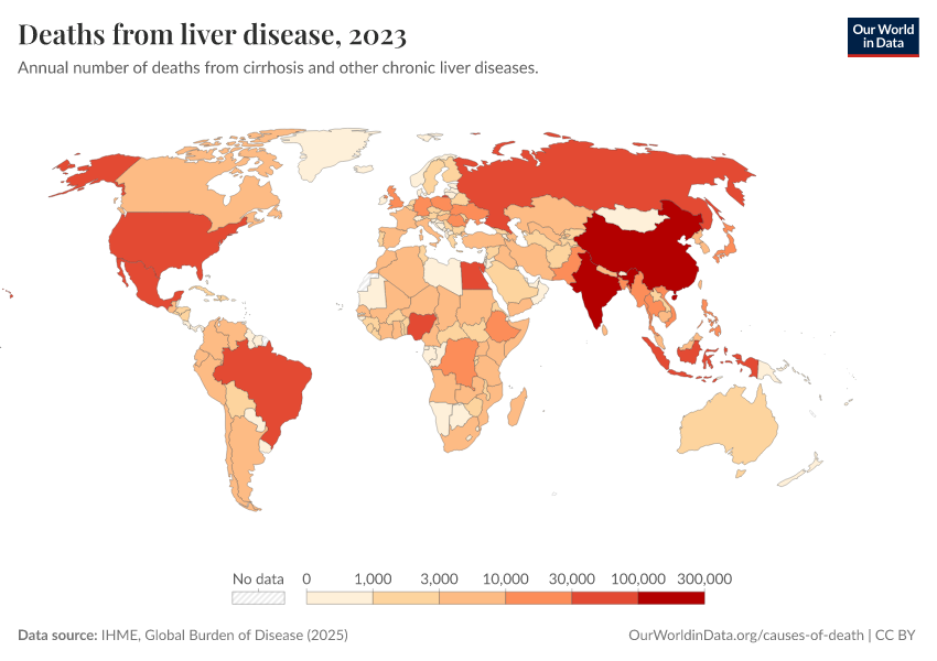 IHME, Global Burden of Disease (2025) – with major processing by Our World in Data. “Deaths from liver disease – IHME” [dataset]. IHME, Global Burden of Disease, “Global Burden of Disease - Deaths” [original data]. Retrieved April 10, 2026 from https://gfs-wave-2-new.owid.pages.dev:8789/20260323-160356/grapher/deaths-from-liver-disease.html (archived on March 23, 2026).