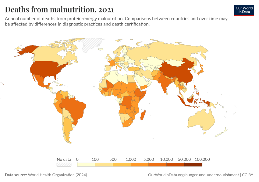 World Health Organization (2024) – with major processing by Our World in Data. “Deaths from malnutrition” [dataset]. World Health Organization, “Global Health Estimates” [original data]. Retrieved April 10, 2026 from https://gfs-wave-2-new.owid.pages.dev:8789/20260330-100833/grapher/deaths-from-malnutrition-ghe.html (archived on March 30, 2026).Download