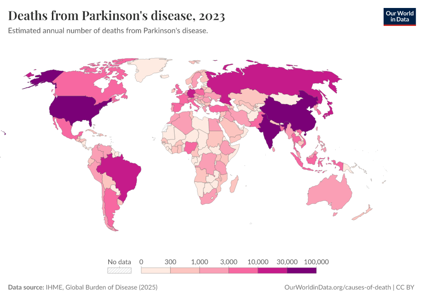 IHME, Global Burden of Disease (2025) – with major processing by Our World in Data. “Deaths from Parkinson's disease – IHME” [dataset]. IHME, Global Burden of Disease, “Global Burden of Disease - Deaths” [original data]. Retrieved April 10, 2026 from https://gfs-wave-2-new.owid.pages.dev:8789/20260323-160356/grapher/deaths-from-parkinsons-disease.html (archived on March 23, 2026).