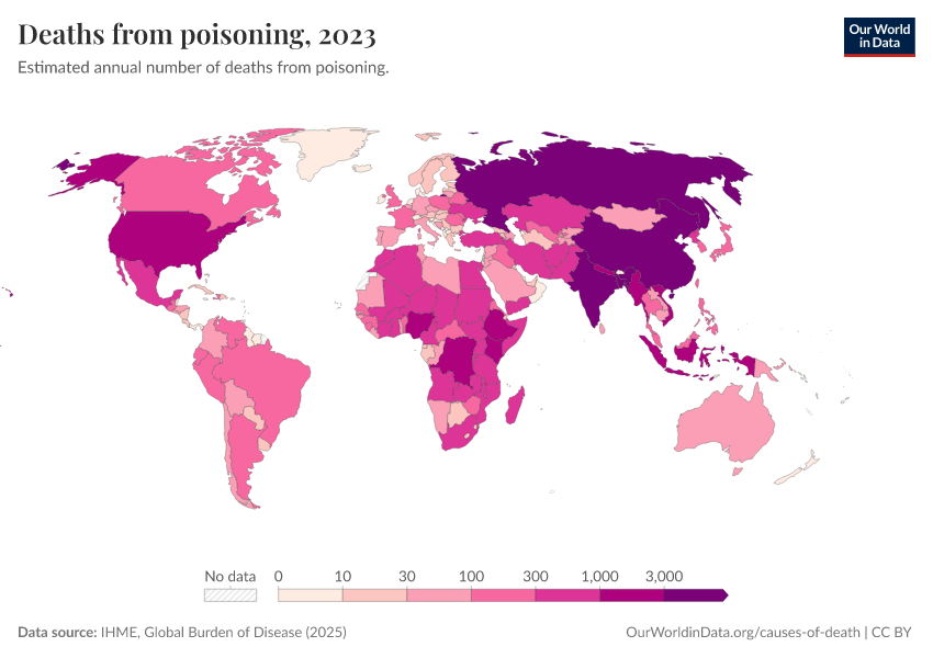“Data Page: Deaths from poisoning”, part of the following publication: Esteban Ortiz-Ospina and Max Roser (2016) - “Global Health”. Data adapted from IHME, Global Burden of Disease. Retrieved from https://gfs-wave-2-new.owid.pages.dev:8789/20260323-160356/grapher/deaths-from-poisoning.html [online resource] (archived on March 23, 2026).How to cite this data