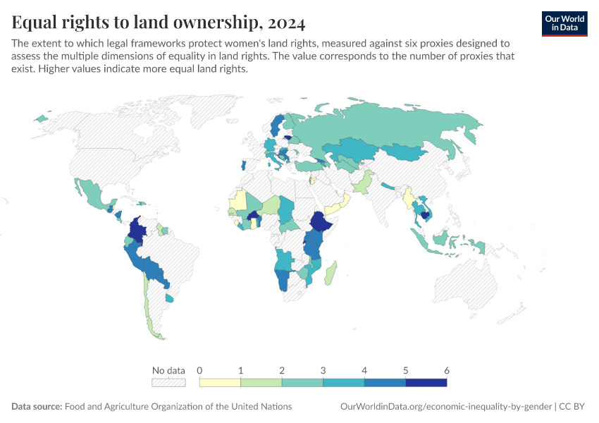 “Data Page: Equal rights to land ownership”. Our World in Data (2026). Data adapted from Food and Agriculture Organization of the United Nations. Retrieved from https://gfs-wave-2-new.owid.pages.dev:8789/20260408-103703/grapher/degree-to-which-the-legal-framework-guarantees-womens-equal-rights-to-land-ownership-andor-control.html [online resource] (archived on April 8, 2026).How to cite this data