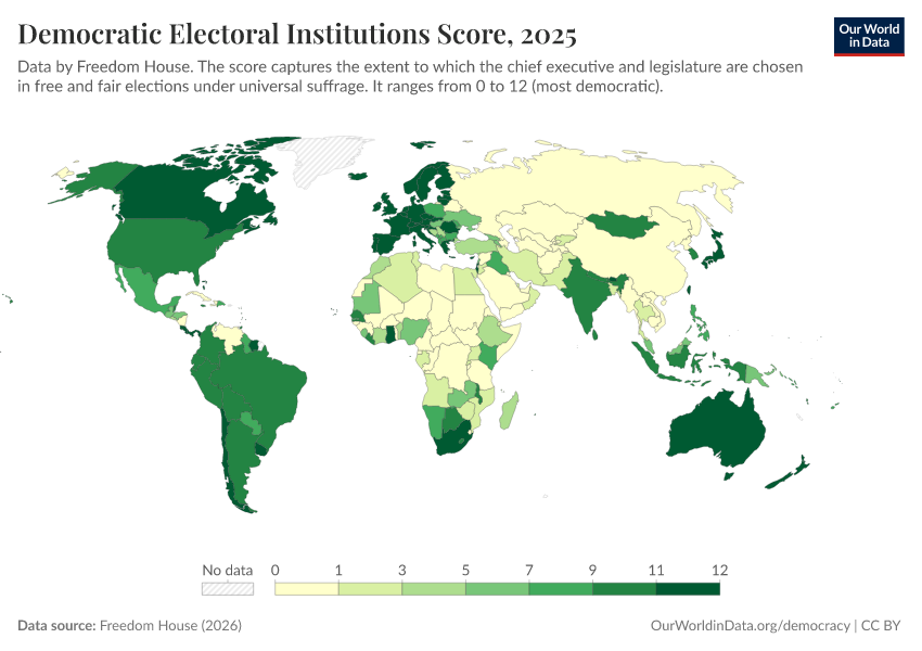 Freedom House (2026) – processed by Our World in Data. “Democratic Electoral Institutions Score” [dataset]. Freedom House, “Freedom in the World” [original data]. Retrieved April 10, 2026 from https://gfs-wave-2-new.owid.pages.dev:8789/20260323-201304/grapher/democratic-electoral-institutions-fh.html (archived on March 23, 2026).Download