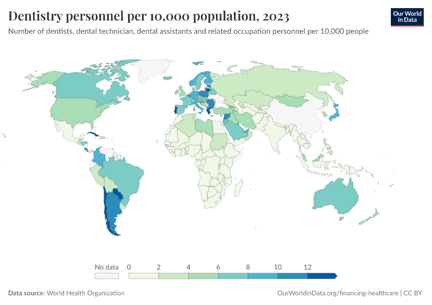 “Data Page: Dentistry personnel per 10,000 population”. Our World in Data (2026). Data adapted from World Health Organization. Retrieved from https://gfs-wave-2-new.owid.pages.dev:8789/20260317-181724/grapher/dentistry-personnel-per-1000.html [online resource] (archived on March 17, 2026).How to cite this data
