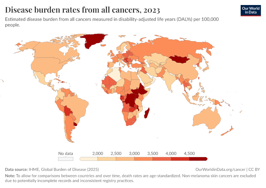 “Data Page: Disease burden rates from all cancers”, part of the following publication: Esteban Ortiz-Ospina and Max Roser (2016) - “Global Health”. Data adapted from IHME, Global Burden of Disease. Retrieved from https://gfs-wave-2-new.owid.pages.dev:8789/20260319-181852/grapher/disease-burden-rates-from-cancers.html [online resource] (archived on March 19, 2026).How to cite this data