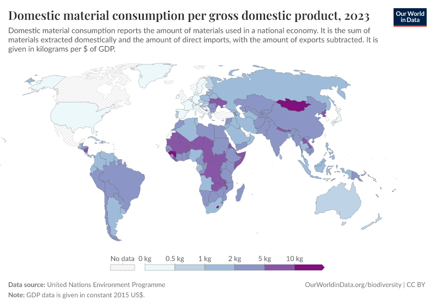 United Nations Environment Programme – processed by Our World in Data. “Domestic material consumption per gross domestic product” [dataset]. United Nations Environment Programme, “WESR / Global Material Flows Database” [original data]. Retrieved April 10, 2026 from https://gfs-wave-2-new.owid.pages.dev:8789/20260304-094028/grapher/domestic-material-consumption-per-unit-of-gdp.html (archived on March 4, 2026).Download