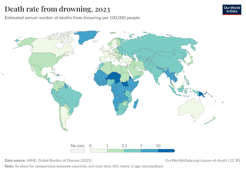 IHME, Global Burden of Disease (2025) – with major processing by Our World in Data. “Death rate from drowning – IHME” [dataset]. IHME, Global Burden of Disease, “Global Burden of Disease - Deaths” [original data]. Retrieved April 10, 2026 from https://gfs-wave-2-new.owid.pages.dev:8789/20260323-161325/grapher/drowning-death-rates.html (archived on March 23, 2026).