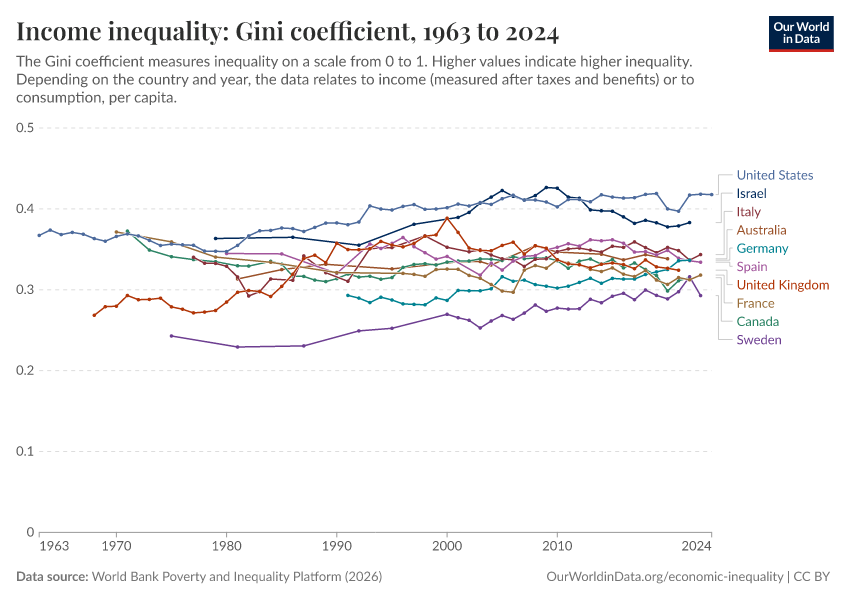 “Data Page: Income inequality: Gini coefficient”, part of the following publication: Joe Hasell, Bertha Rohenkohl, Pablo Arriagada, Esteban Ortiz-Ospina, and Max Roser (2023) - “Economic Inequality”. Data adapted from World Bank Poverty and Inequality Platform. Retrieved from https://gfs-wave-2-new.owid.pages.dev:8789/20260325-171315/grapher/economic-inequality-gini-index.html [online resource] (archived on March 25, 2026).How to cite this data