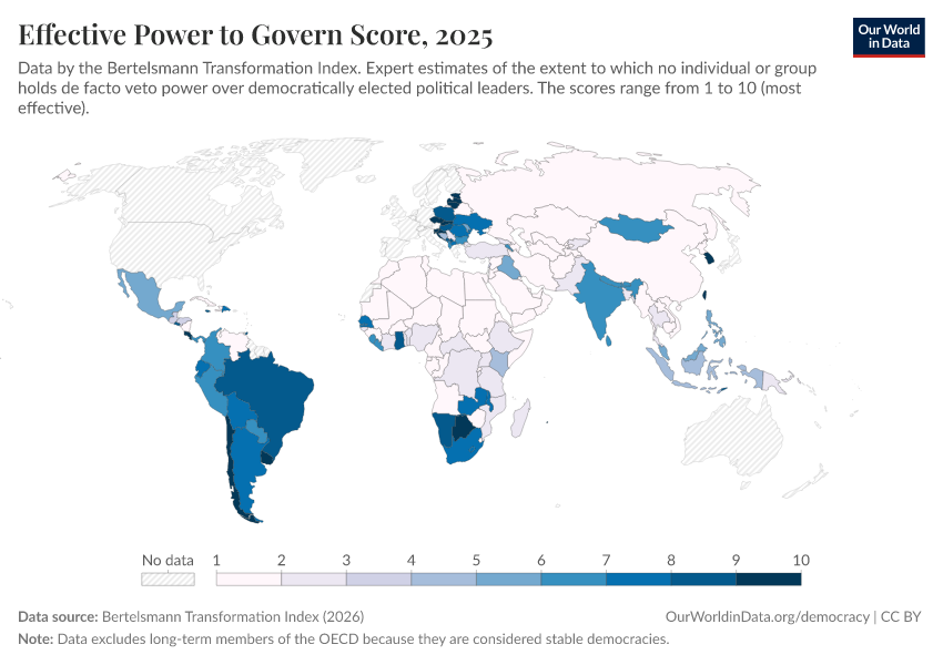“Data Page: Effective Power to Govern Score”, part of the following publication: Bastian Herre, Lucas Rodés-Guirao, and Esteban Ortiz-Ospina (2013) - “Democracy”. Data adapted from Bertelsmann Transformation Index. Retrieved from https://gfs-wave-2-new.owid.pages.dev:8789/20260327-184752/grapher/effective-power-to-govern-score-bti.html [online resource] (archived on March 27, 2026).How to cite this data