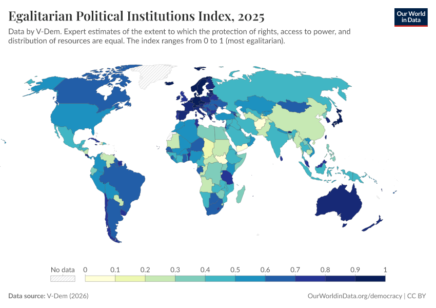 “Data Page: Egalitarian political institutions index”, part of the following publication: Bastian Herre, Lucas Rodés-Guirao, and Esteban Ortiz-Ospina (2013) - “Democracy”. Data adapted from V-Dem. Retrieved from https://gfs-wave-2-new.owid.pages.dev:8789/20260402-164039/grapher/egalitarian-political-institutions-index.html [online resource] (archived on April 2, 2026).How to cite this data