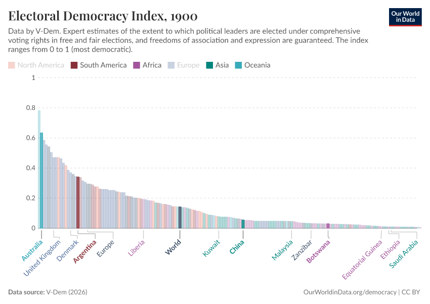 “Data Page: Electoral democracy index”, part of the following publication: Bastian Herre, Lucas Rodés-Guirao, and Esteban Ortiz-Ospina (2013) - “Democracy”. Data adapted from V-Dem. Retrieved from https://gfs-wave-2-new.owid.pages.dev:8789/20260402-164039/grapher/electoral-democracy-index.html [online resource] (archived on April 2, 2026).How to cite this data