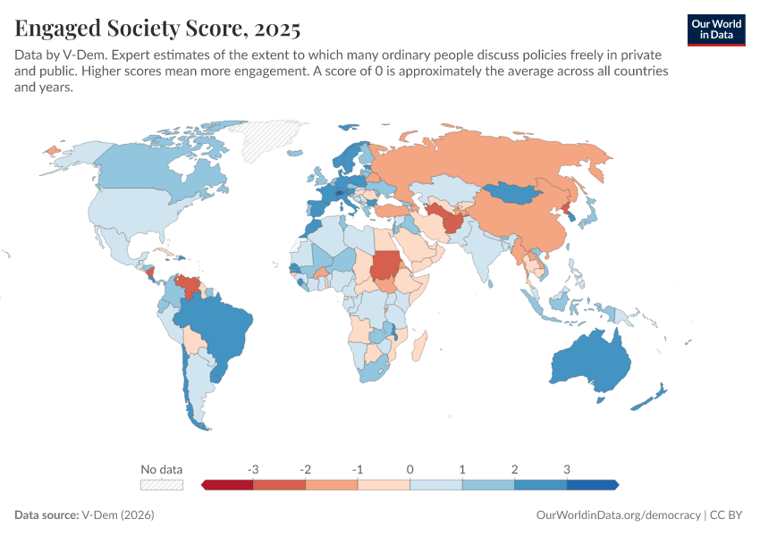 “Data Page: Engaged society”, part of the following publication: Bastian Herre, Lucas Rodés-Guirao, and Esteban Ortiz-Ospina (2013) - “Democracy”. Data adapted from V-Dem. Retrieved from https://gfs-wave-2-new.owid.pages.dev:8789/20260402-164039/grapher/engaged-society-score.html [online resource] (archived on April 2, 2026).How to cite this data