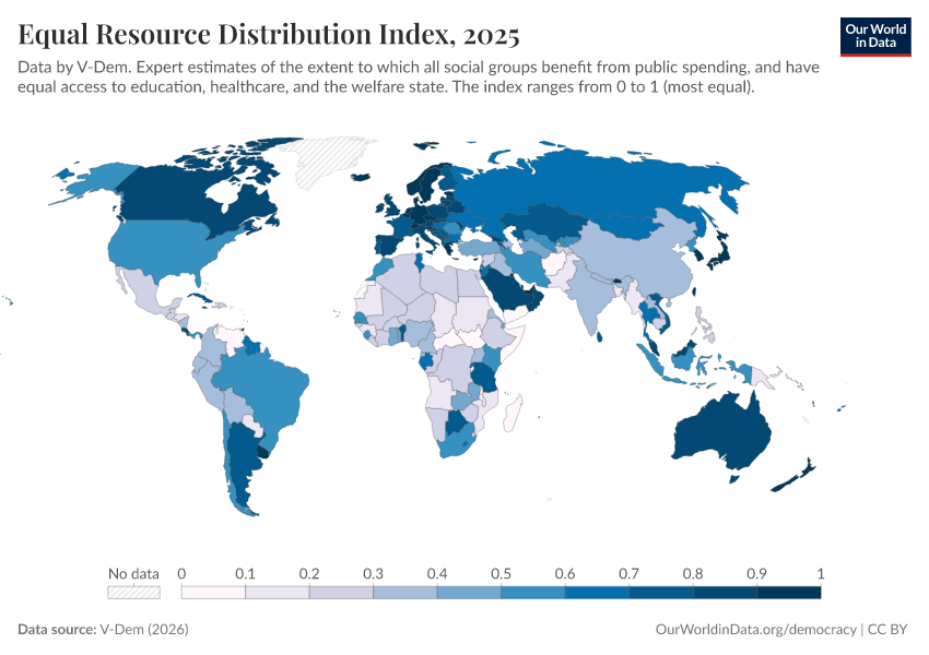“Data Page: Equal resource distribution index”, part of the following publication: Bastian Herre, Lucas Rodés-Guirao, and Esteban Ortiz-Ospina (2013) - “Democracy”. Data adapted from V-Dem. Retrieved from https://gfs-wave-2-new.owid.pages.dev:8789/20260402-164039/grapher/equal-resource-distribution-index.html [online resource] (archived on April 2, 2026).How to cite this data