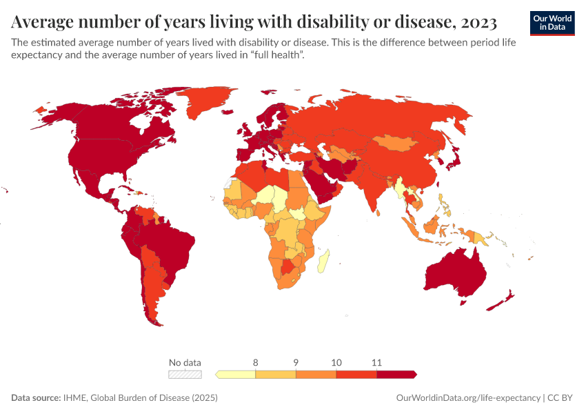 “Data Page: Average number of years living with disability or disease”, part of the following publication: Saloni Dattani, Lucas Rodés-Guirao, Hannah Ritchie, Esteban Ortiz-Ospina, and Max Roser (2023) - “Life Expectancy”. Data adapted from IHME, Global Burden of Disease. Retrieved from https://gfs-wave-2-new.owid.pages.dev:8789/20260319-175416/grapher/expected-years-of-living-with-disability-or-disease-burden.html [online resource] (archived on March 19, 2026).How to cite this data