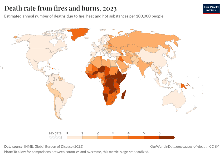 IHME, Global Burden of Disease (2025) – with major processing by Our World in Data. “Death rate from fires and burns – IHME” [dataset]. IHME, Global Burden of Disease, “Global Burden of Disease - Deaths” [original data]. Retrieved April 10, 2026 from https://gfs-wave-2-new.owid.pages.dev:8789/20260323-161325/grapher/fire-death-rates.html (archived on March 23, 2026).