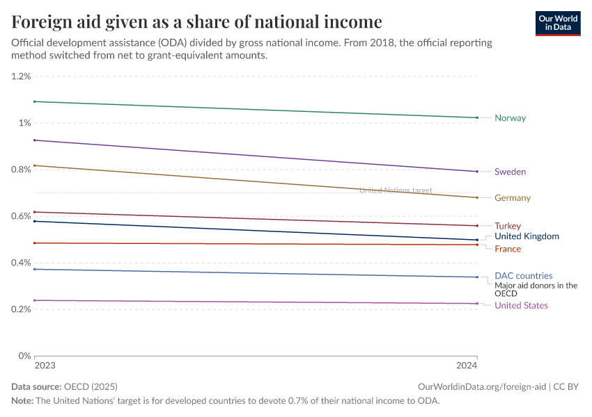OECD (2025) – with minor processing by Our World in Data. “Foreign aid given as a share of national income – Official estimate” [dataset]. OECD, “OECD Official Development Assistance (ODA) - DAC1: Flows by provider (ODA+OOF+Private)” [original data]. Retrieved April 10, 2026 from https://gfs-wave-2-new.owid.pages.dev:8789/20260304-094028/grapher/foreign-aid-given-as-a-share-of-national-income.html (archived on March 4, 2026).Download