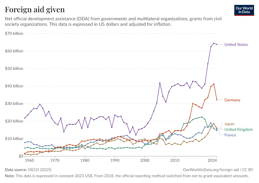 OECD (2025) – with major processing by Our World in Data. “Foreign aid given – Net disbursements” [dataset]. OECD, “OECD Official Development Assistance (ODA) - DAC1: Flows by provider (ODA+OOF+Private)”; OECD, “OECD Official Development Assistance (ODA) - DAC2A: Aid (ODA) disbursements to countries and regions” [original data]. Retrieved April 10, 2026 from https://gfs-wave-2-new.owid.pages.dev:8789/20260304-094028/grapher/foreign-aid-given-net.html (archived on March 4, 2026).Download