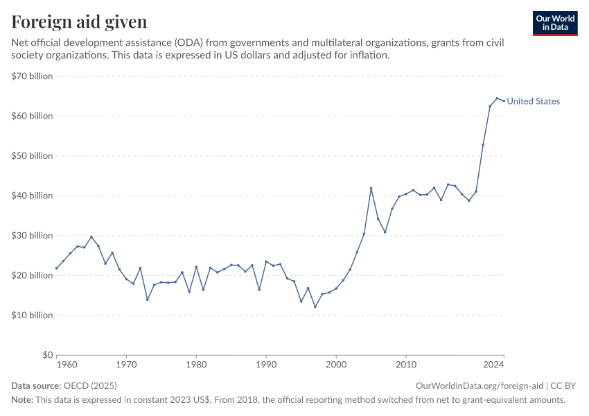 OECD (2025) – with major processing by Our World in Data. “Foreign aid given – Net disbursements” [dataset]. OECD, “OECD Official Development Assistance (ODA) - DAC1: Flows by provider (ODA+OOF+Private)”; OECD, “OECD Official Development Assistance (ODA) - DAC2A: Aid (ODA) disbursements to countries and regions” [original data]. Retrieved April 10, 2026 from https://gfs-wave-2-new.owid.pages.dev:8789/20260304-094028/grapher/foreign-aid-given-net.html (archived on March 4, 2026).Download