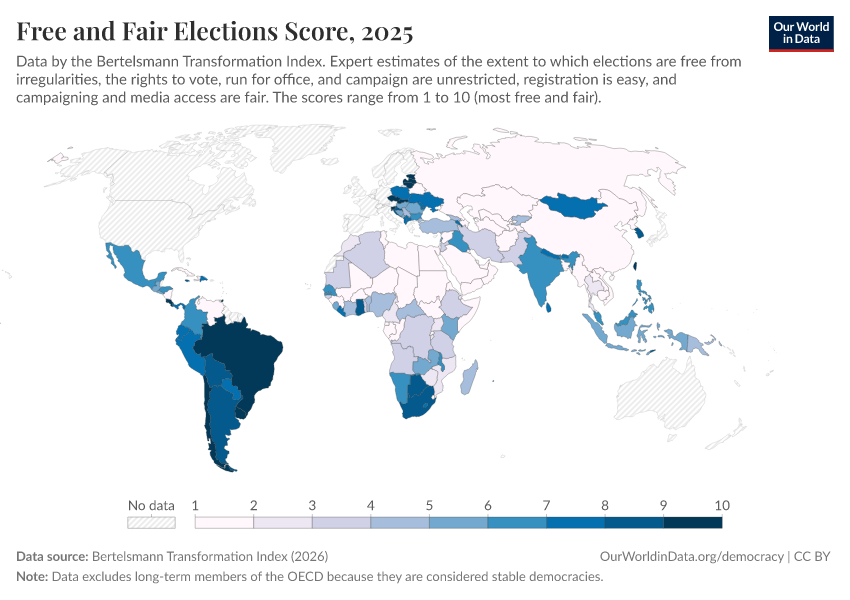 Bertelsmann Transformation Index (2026) – processed by Our World in Data. “Free and Fair Elections Score” [dataset]. Bertelsmann Transformation Index, “Bertelsmann Transformation Index, Scores” [original data]. Retrieved April 10, 2026 from https://gfs-wave-2-new.owid.pages.dev:8789/20260327-184752/grapher/free-fair-elections-bti.html (archived on March 27, 2026).Download