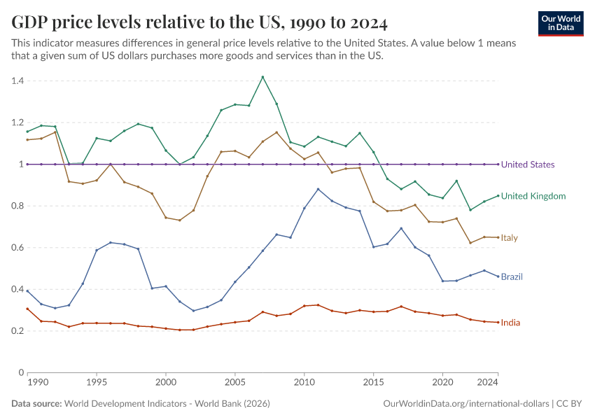 “Data Page: GDP price levels relative to the US”, part of the following publication: Max Roser, Bertha Rohenkohl, Pablo Arriagada, Joe Hasell, Hannah Ritchie, and Esteban Ortiz-Ospina (2023) - “Economic Growth”. Data adapted from World Development Indicators - World Bank. Retrieved from https://gfs-wave-2-new.owid.pages.dev:8789/20260304-094028/grapher/gdp-price-levels-relative-to-the-us.html [online resource] (archived on March 4, 2026).