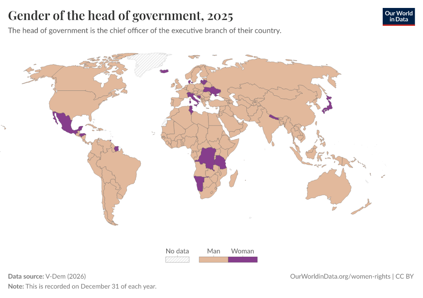 V-Dem (2026) – processed by Our World in Data. “Gender of the head of government” [dataset]. V-Dem, “Democracy report v16” [original data]. Retrieved April 10, 2026 from https://gfs-wave-2-new.owid.pages.dev:8789/20260318-112846/grapher/gender-of-the-head-of-government.html (archived on March 18, 2026).Download